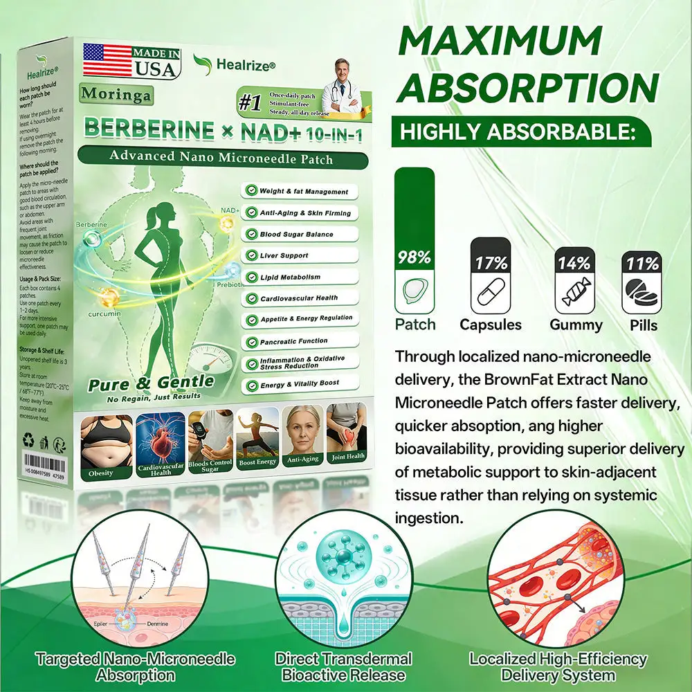 Through localized nano-microneedle delivery, the BrownFat Extract Nano Microneedle Patch supports glucose regulation and metabolic efficiency by targeting skin-adjacent metabolic tissue rather than relying on systemic ingestion. Bioactive compounds such as cinnamon polyphenols, berberine, and green tea EGCG modulate glucose uptake and utilization at the tissue level, helping attenuate post-meal glucose fluctuations and improve metabolic flexibility. By supporting insulin sensitivity and promoting more efficient hepatic glucose handling, the patch contributes to steadier energy release and reduced glycemic volatility throughout the day. In parallel, activation of brown adiposeโassociated pathways enhances mitochondrial fuel utilization, shifting excess glucose and fatty acids toward energy dissipation rather than storage. With consistent use, this localized, multi-pathway approach supports improved glucose stability, enhanced insulin responsiveness, more efficient energy metabolism, and smoother, more controlled glycemic patternsโwithout sharp spikes or crashes.