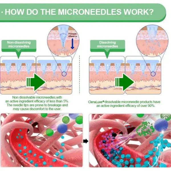 Each needle is 0.27mm long, just 1/7 the thickness of a hair, and made from a dissolvable medication. These microneedles are precision-engineered using the latest manufacturing techniques to ensure a seamless, pain-free experience while effectively delivering active ingredients directly into the skin.