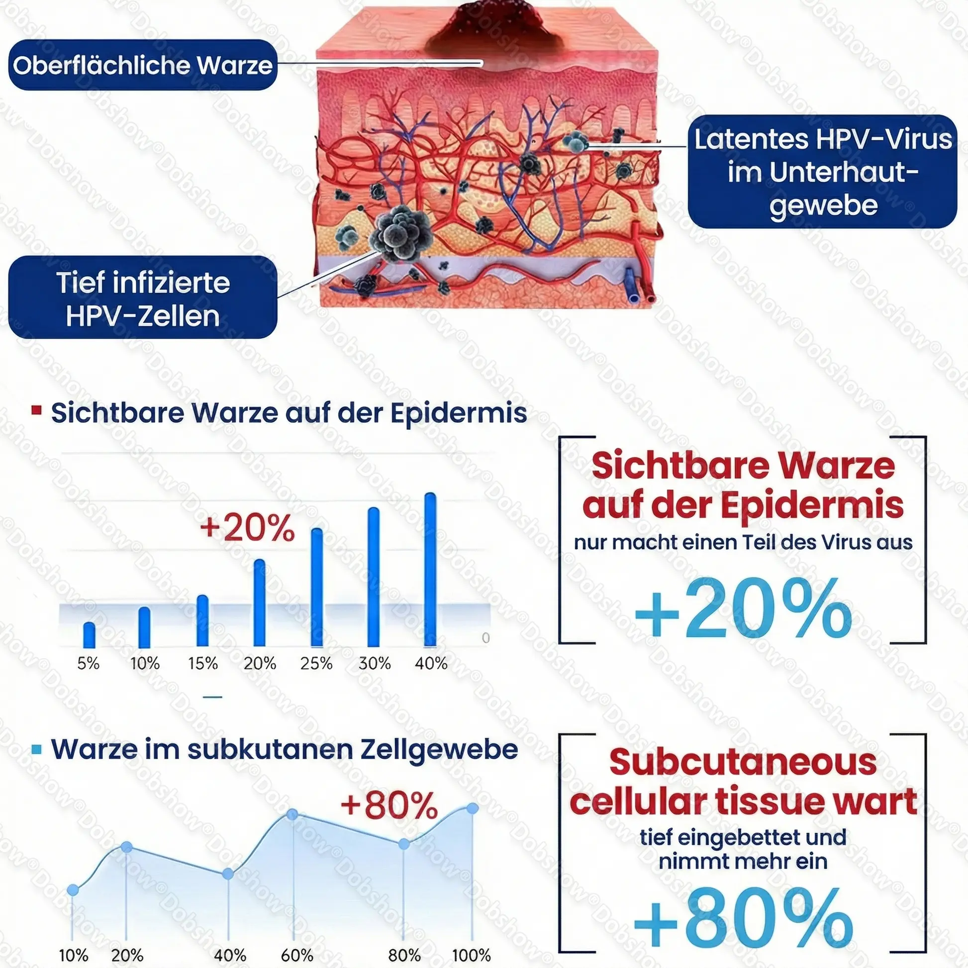 Die meisten Behandlungen zielen nur auf den sichtbaren Oberflächenteil von Warzen ab—das sind etwa 20% des gesamten Warzengewebes. Die restlichen 80% verbergen sich unter der Haut, wo das humane Papillomavirus (HPV) weiter überlebt. Wenn die Behandlung nur äußere Läsionen anspricht und das tiefer liegende infizierte Gewebe nicht erreicht, wird das Problem oft wiederkehren.