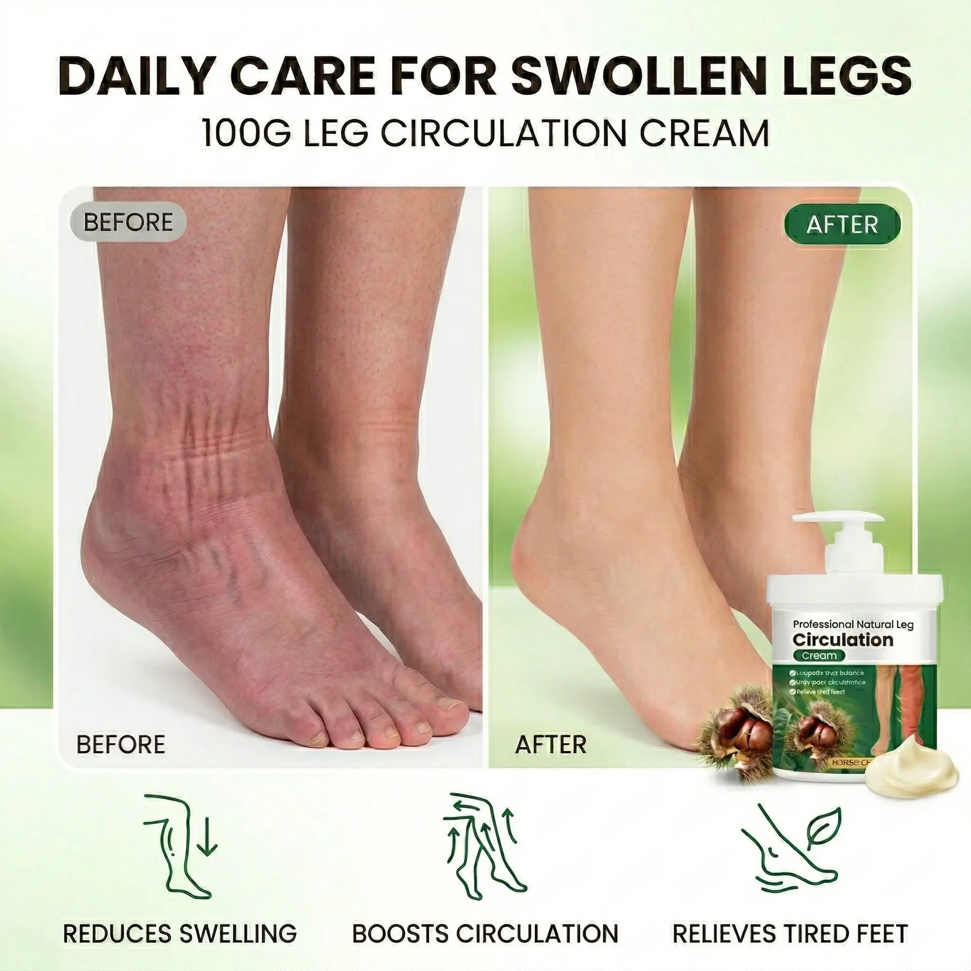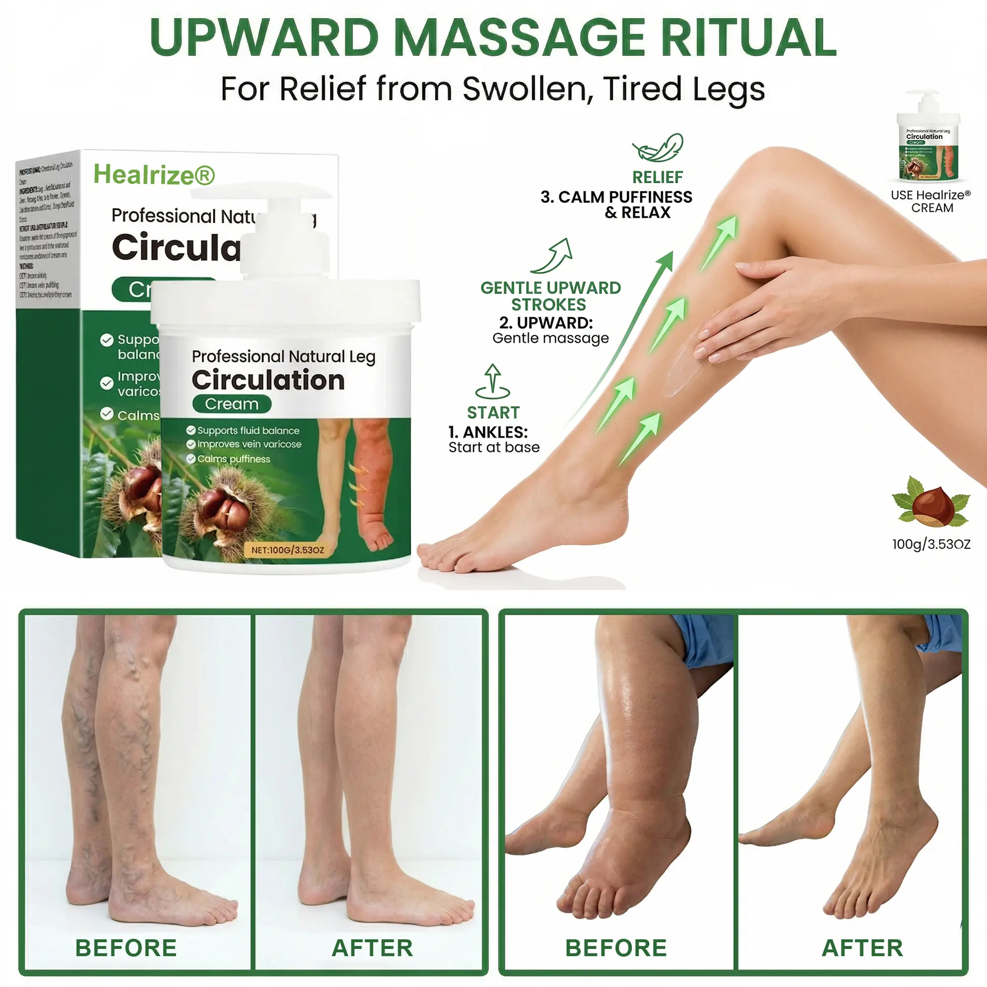 Long hours of standing or sitting, heat, aging, inactivity, and circulation stress can all contribute to swollen calves, puffy ankles, leg fatigue, and visible discomfort. Healrize® Professional Natural Leg Circulation Cream is designed to become part of your daily leg care routine—helping your legs feel lighter, look smoother, and stay more comfortable throughout the day.