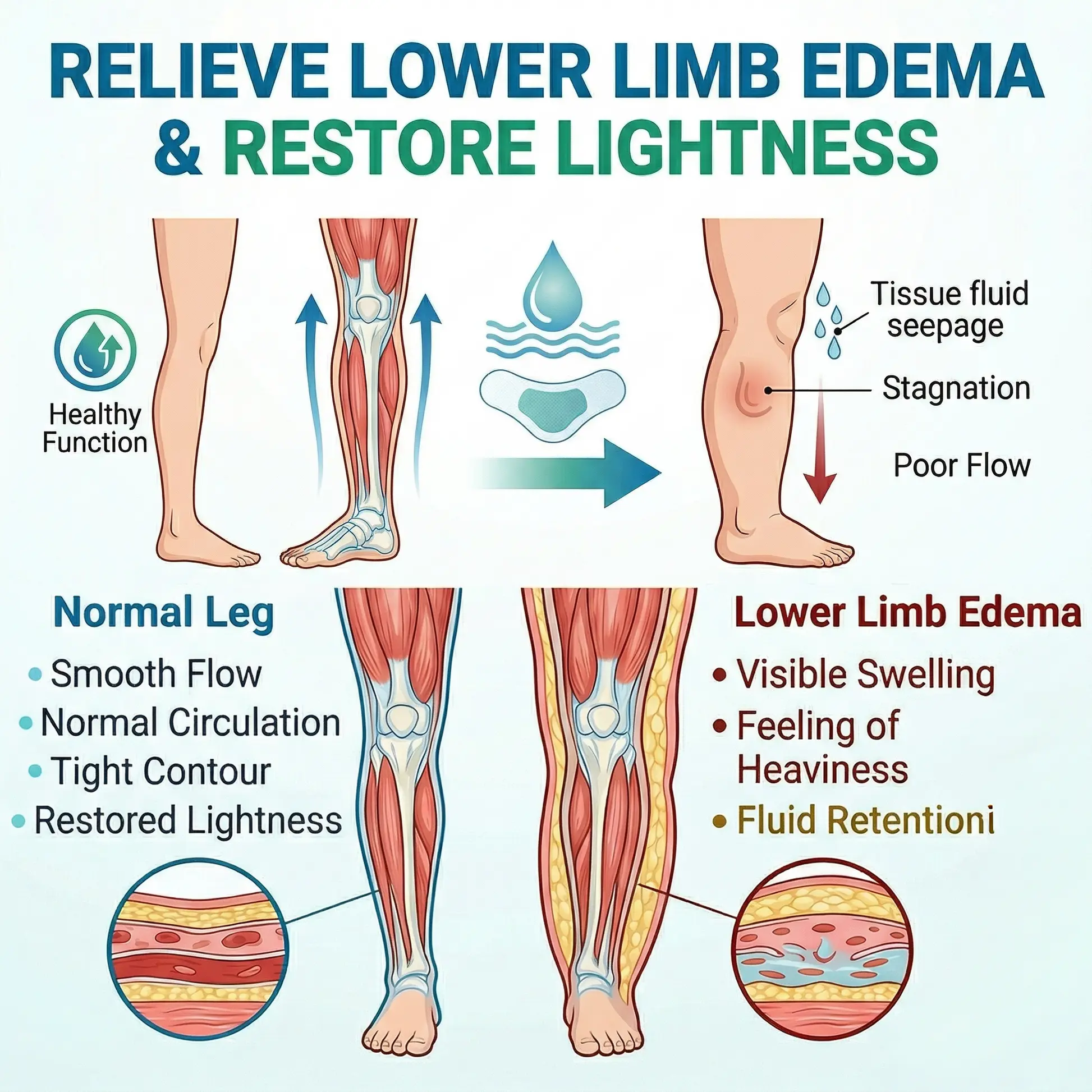 Lower-limb swelling can be associated with fluid retention, prolonged standing or sitting, circulation stress, muscle fatigue, and reduced venous return. This often shows up as puffy ankles, tight calves, heaviness, visible sock marks, and an overall tired-leg feeling by the end of the day.