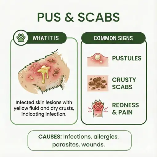 Key causes behind pus and scabs include: bacterial/fungal infections, allergic reactions, parasitic infestations (e.g., mites), and untreated wounds.