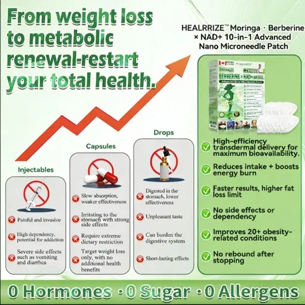 Healrizeยฎ๐ด๐๐๐๐๐๐ฎ ยท ๐๐ฒ๐ฟ๐ฏ๐ฒ๐ฟ๐๐ฃ๐ ร ๐๐ผ๐+ ๐๐-๐ข๐ง-๐ ๐๐ฑ๐๐ฎ๐ป๐ฐ๐๐ ๐๐๐ฃ๐ค ๐๐๐๐ง๐ค๐ฃ๐๐๐๐ฅ๐ ๐๐๐ญ๐๐ ย was developed through more than 20 years of research by a multidisciplinary team of over 30 experts. Each patch incorporates an ultra-fine microneedle architecture measuring approximately one-seventh the thickness of a human hair. designed to ensure a smooth and virtually painless application. The formulation contains highly concentrated natural bioactive compounds. up to 20-fold higher than conventional market levels. including Moringa and Berberine. which act synergistically to support healthy glycemic responses. appetite regulation. and lipid metabolism. thereby promoting gradual and sustainable weight management. Enriched with NAD+.the patch further supports skin firmness and structural resilience during body-weight fluctuations. helping maintain a lean appearance without compromising comfort or aesthetics. Additional high-efficacy components contribute to the support of immune function. digestive health. gut balance. women’s health. daily energy levels. and fatigue reduction. collectively promoting a more youthful and resilient physiological state from within. This product meets the quality standards of the Canadian Health Discussion Organization and requires no injections. Based on scientific principles. it provides a safe and comprehensive approach to effectively control weight and promote long-term metabolic health. designed to work in harmony with the body rather than against it.