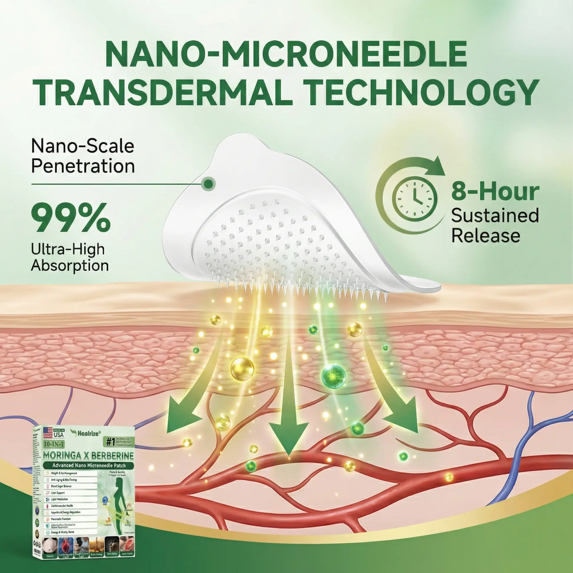 Say goodbye to traditional pills and restrictive dieting. Proudly made in the USA, Healrize® Advanced Nano Microneedle technology delivers active ingredients directly into your bloodstream with a 99% absorption rate—making weight and metabolic management as simple as applying a bandage.