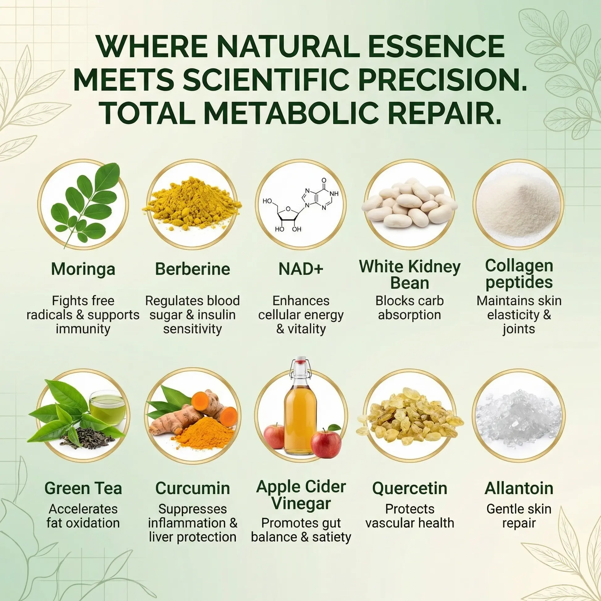 - NAD+: A core coenzyme for cellular energy, enhancing vitality, reducing fatigue, and supporting anti-aging cell repair.